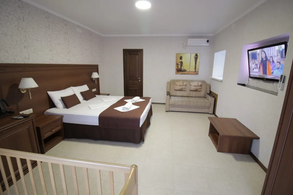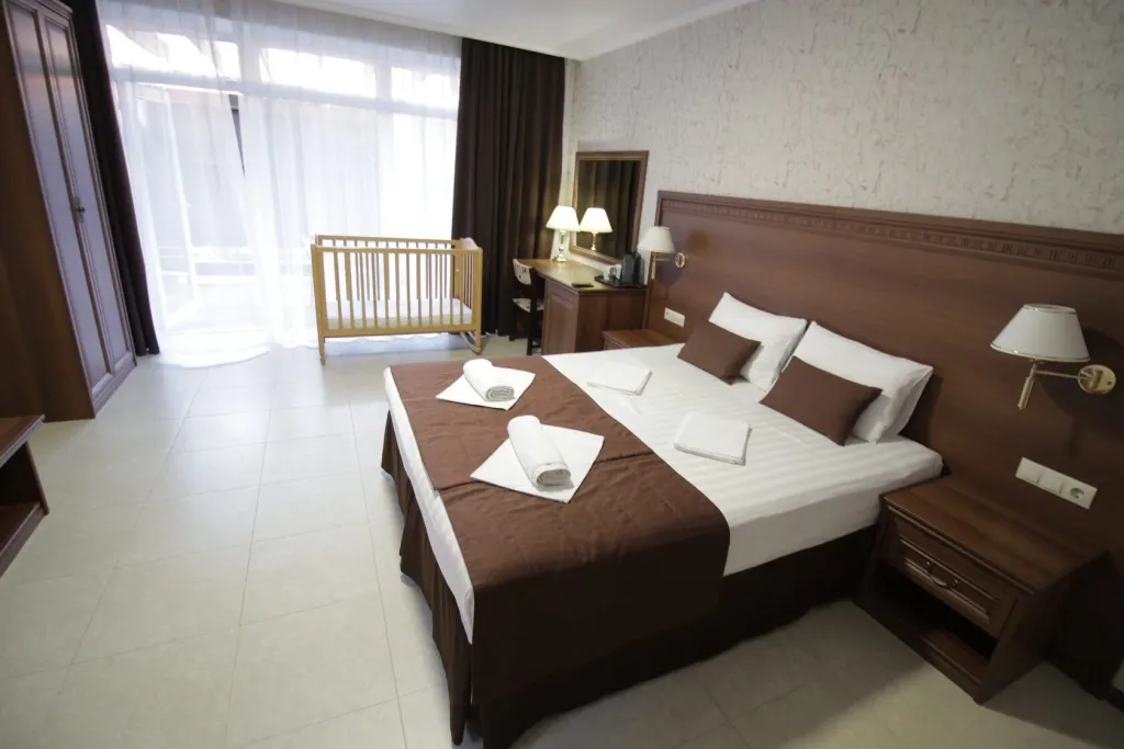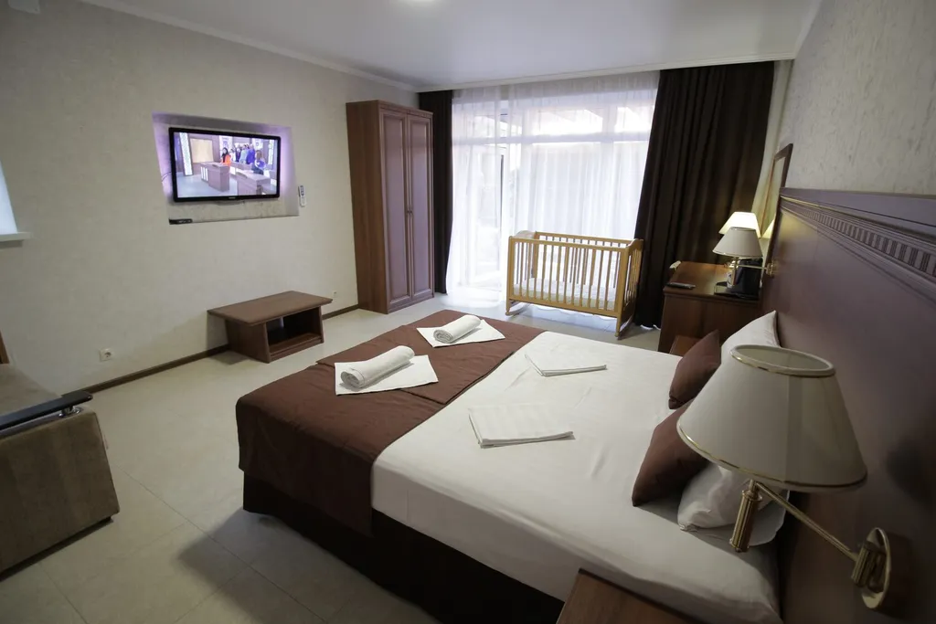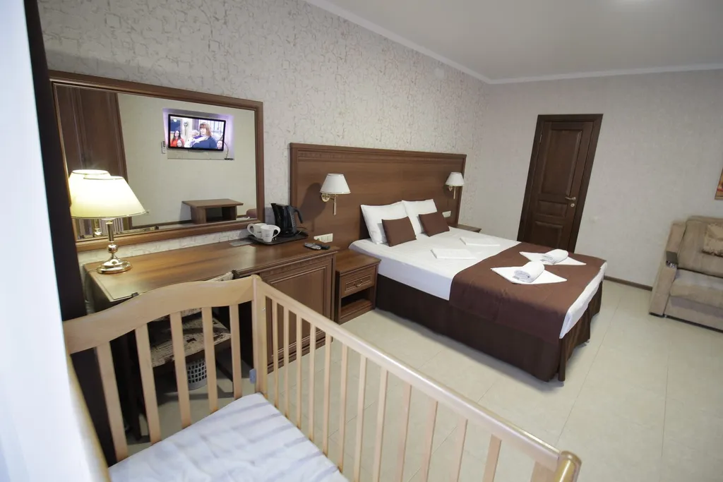 В номере двуспальная кровать, диван-кровать, детская кроватка, шкаф, журнальный столик, туалетный столик, кондиционер, телевизор, санузел с ванной.