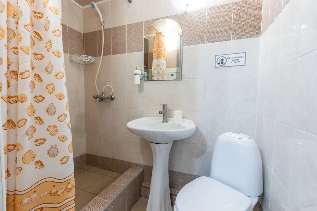 Совмещённый душ и туалет, полотенца все кроме пляжных, постельное белье.