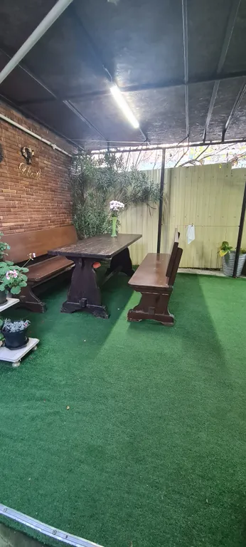 Кровать двуспальная - 2шт, диван двуспальный - 1шт, стол с лавочками под навесом во дворе.